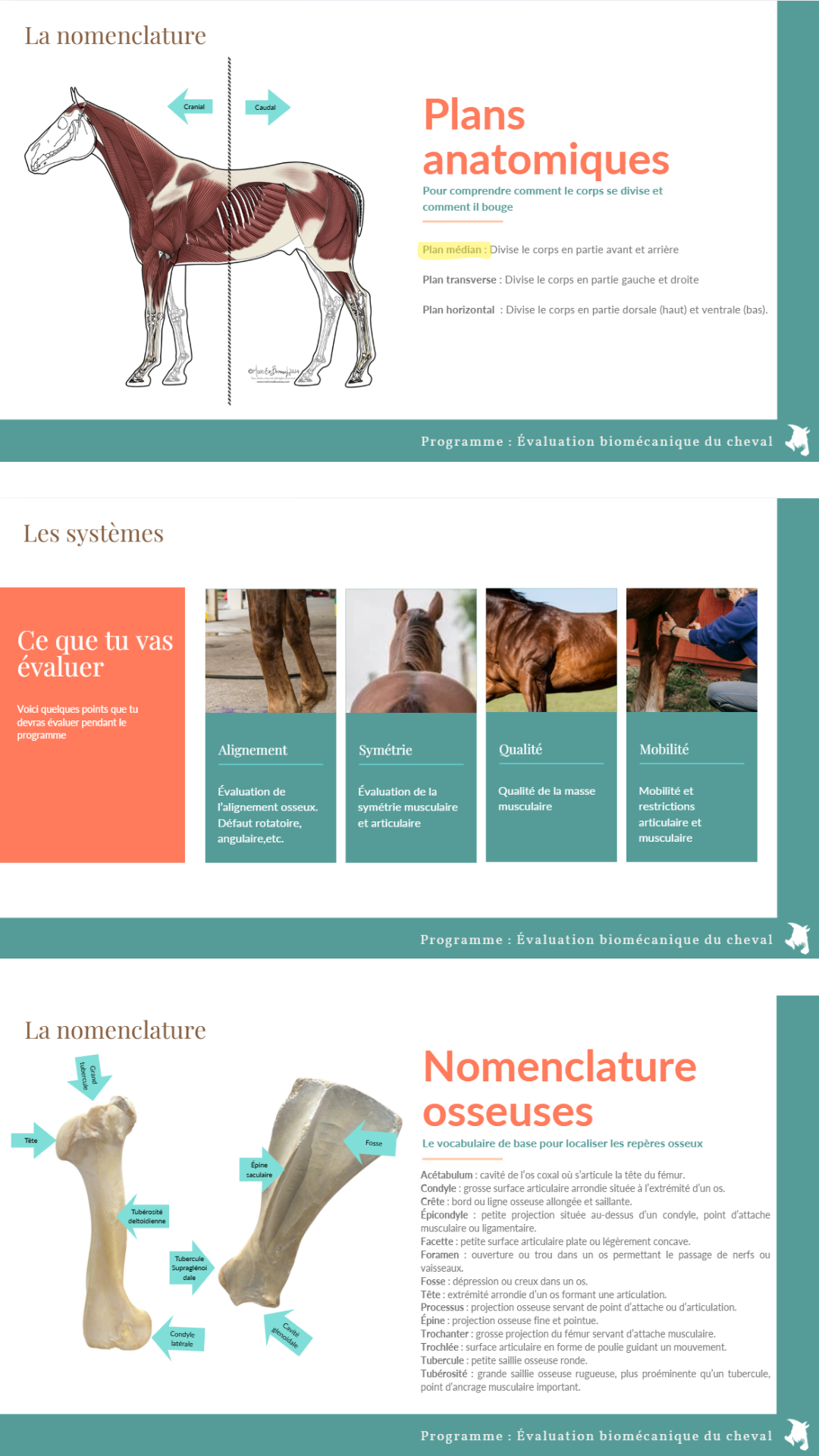 Environnement, nutrition, éléments qui influencent la posture. Évaluation des dents, des ulcères, des pieds et du parage. Compréhension de la musculature et de l'équilibre musculaire.